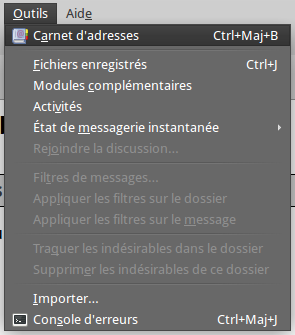 Passer maintenant sur l'ordinateur pour importer les contacts, comme tout à l'heure après avoir lancé Mozilla Thunderbird dans la barre de menu cliquer sur Outils puis sur Carnet d'adresses :