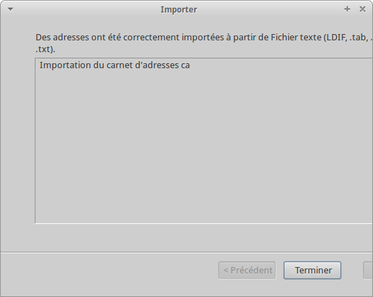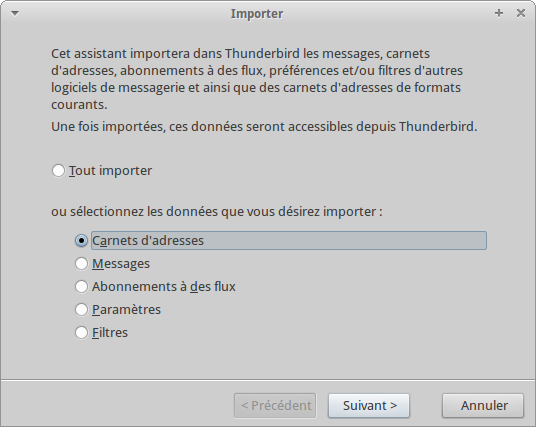 Dans la nouvelle fenêtre qui s'affiche cliquer sur Carnets d'adresses puis sur le bouton Suivant :