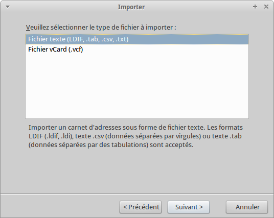 Dans la fenêtre suivante cliquer sur la ligne Fichier texte(LDIF,.tab,.csv,.txt) puis cliquer sur le bouton Suivant :