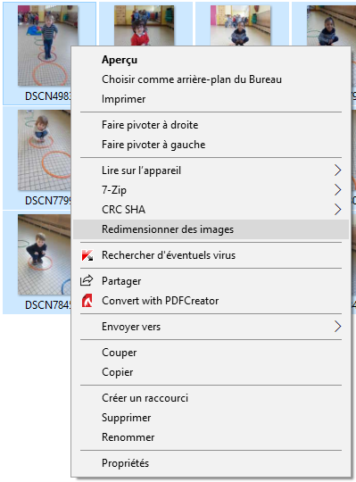 Après avoir sélectionné la ou les photos, cliquer avec le bouton droit de la souris sur l'une d'entre elles, puis dans le menu qui s'affiche, cliquer sur la ligne Redimensionner des images :