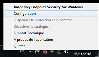 Tout d'abord, cliquer droit sur l'icône Kaspersky en bas et à droite de l'écran, puis dans la liste qui s'affiche, cliquer sur Configuration :