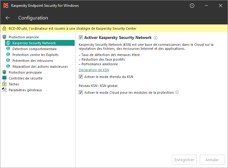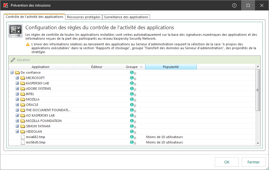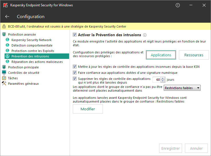 Dans la liste sur le côté gauche de la fenêtre, cliquer sur la ligne Prévention des intrusions :