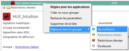 Dans la liste des applications, cliquer droit sur la ligne hue camera manager.exe, puis dans le menu qui s'affiche, cliquer sur la ligne Déplacer dans le groupe > puis cliquer sur la ligne De confiance :