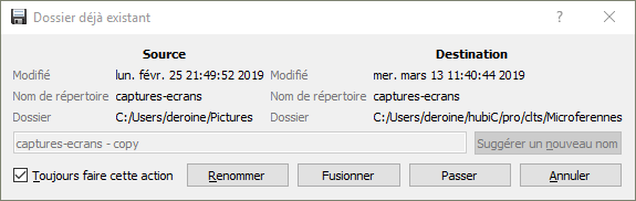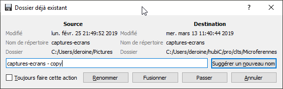 Lors de l'utilisation d'Ultracopier si un dossier existe déjà une question est posée :