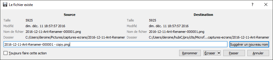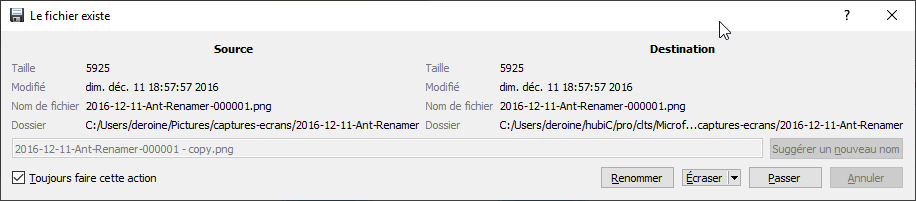 Et lors de l'utilisation d'Ultracopier si un fichier existe déjà une question est posée :